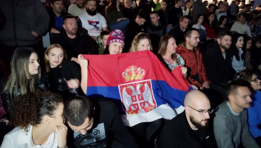 У пуној "Хали спортова" у северној Косовској Митровици прву утакмицу Србије на Светском првенству прати више стотина навијача.