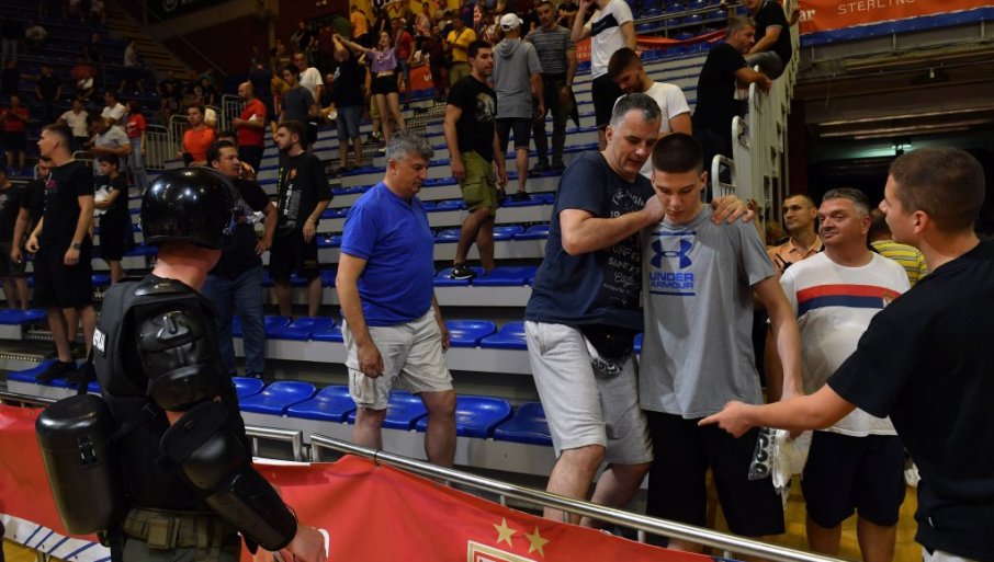 Након што су навијачи Звезде обасипали са трибина судијску тројку Саша Пукл, Томислав Хордов и МИлош Кољеншић, дошло је прво до пражњења једног сектора, а потом и целе дворане.