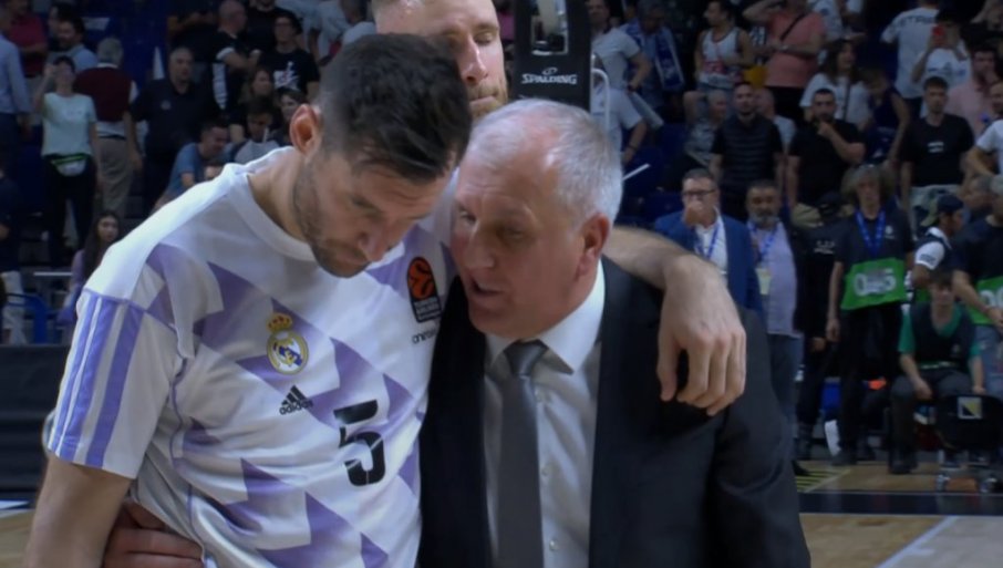 ... а Жељко Обрадовић је загрлио легенду Реала, Рудија Фернандеза, и тешио га после, за Мадриђане, врло тешког пораза.