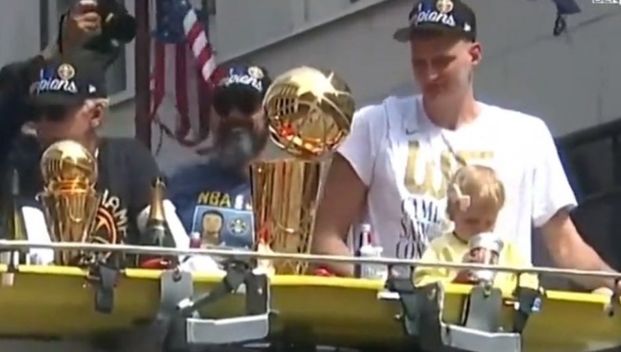 Наиме, Никола Јокић је са супругом Наталијом и њиховом ћеркицом Огњеном био на предњем делу ватрогасног возила у коме су били и шампионски НБА трофеј, али и његов МВП пехар из финала.