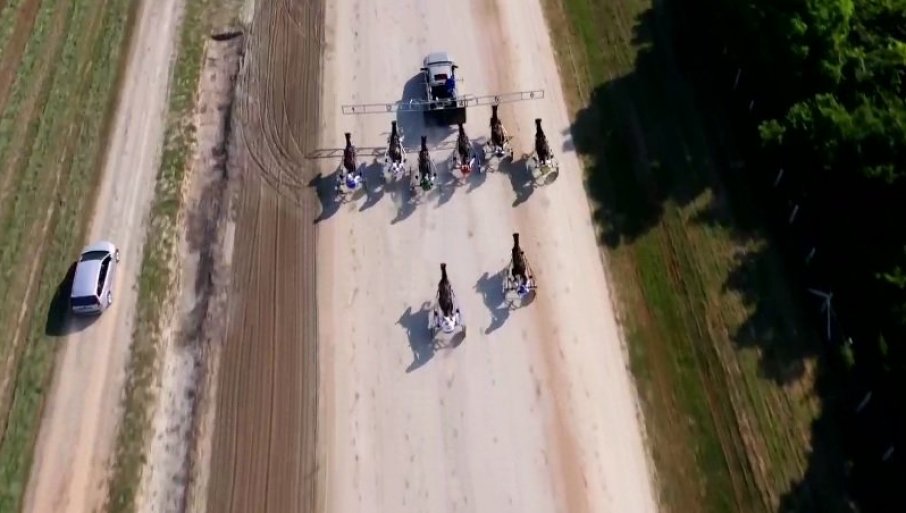 15.53 - Док се чека касачка трка заказана за 15 часова, публика ужива у загревању такмичара у сулкама, а са звучника сомборског хиподрома већ дуже времена се чује инструментал "Марша на дрину". Трибине су препуне...