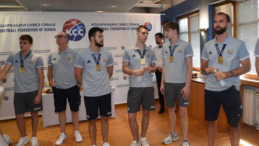 ЧЛАНОВИ мушке јуниорске репрезентације Србије, која је тријумфовала на Европском првенству у Нишу и уписала се у анале наше кошарке, посетили су данас "Кућу кошарке", где их је угостио председник Кошаркашког савеза Србије Предраг Даниловић.