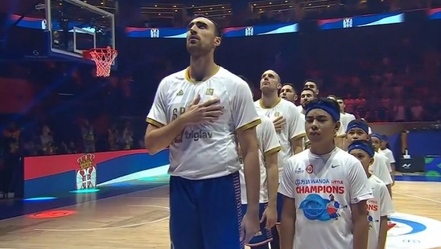 10.38 - Емотивни моменти. Певали су репрезентативци Србије "Боже правде", неко са дланом преко срца, неко попут Стефана Јовића, са три прста усмерена ка срцу.