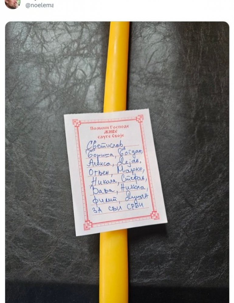 Јер, у цркви је неко на папирић, који је насловљен одштампаним словима "Помени Господе живе слуге своје", написао руком следећа имена: