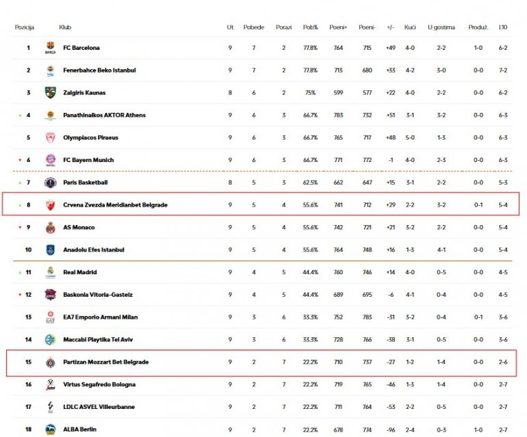 ТАБЕЛА ЕВРОЛИГЕ: Навијачи Звезде ликују, а партизановци се хватају за главу (ФОТО)