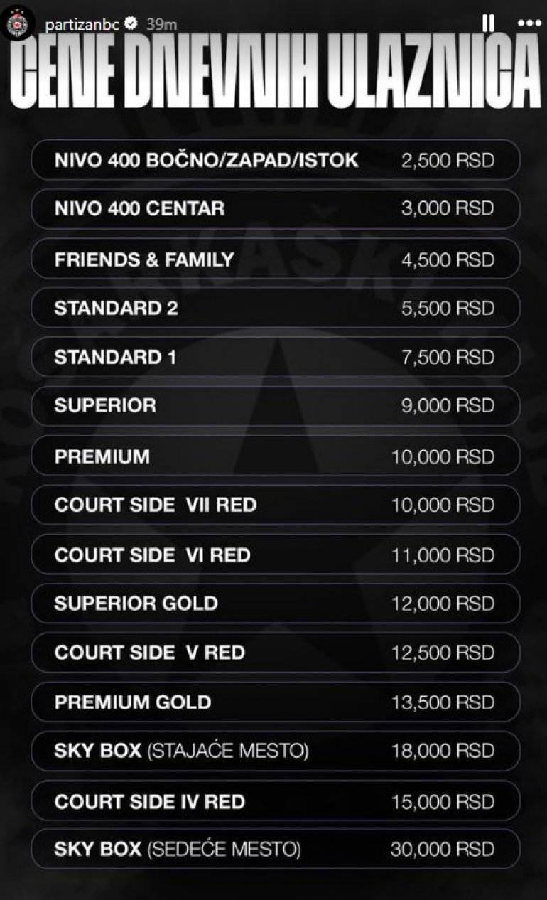 Црно-бели су саопштили цене улазница као и да се продавати искључиво члановима КК Партизан Моззарт Бет, са плаћеном чланарином за 2025. годину. Цене су од 2.500 динара за Ниво 400 бочно/запад/исток до 30.000 динара у Скај боксу.