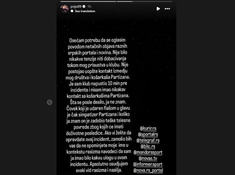 - Осећам потребу да се огласим поводом нетачних објава разних српских портала и новина. Није било никакве тензије, нити добацивања током мог присуства у клубу. Није постојао уопште контакт између мог друштва и кошаркаша Партизана. Ја сам клуб напустио 10 минута пре инцидента и нисам имао никакав контакт са кошаркашима Партизана. Шта се после десило, ја не знам - почео је српски фудбалер.