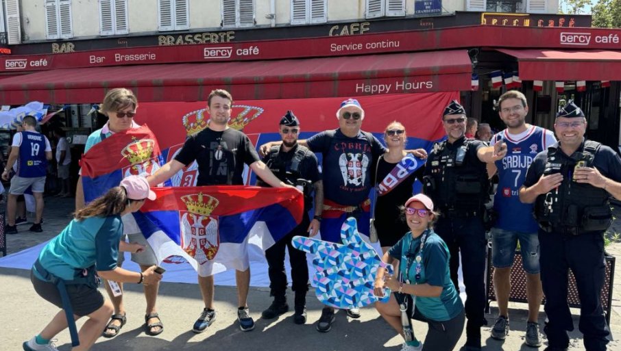 Рецимо, француски полицајац Франк данас је постао деда и решио да се слика заједно с колегама и нашим навијачима који су пошли на четвртфинале кошаркаша: