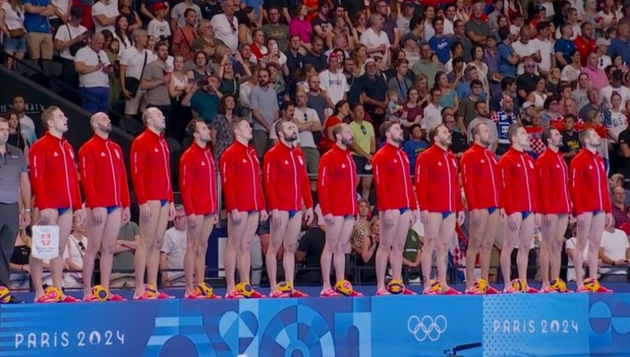 Ватерполо репрезентација Србије непосредно пред почетак олимпијског финала с Хрватском / Screenshot / Eurosport