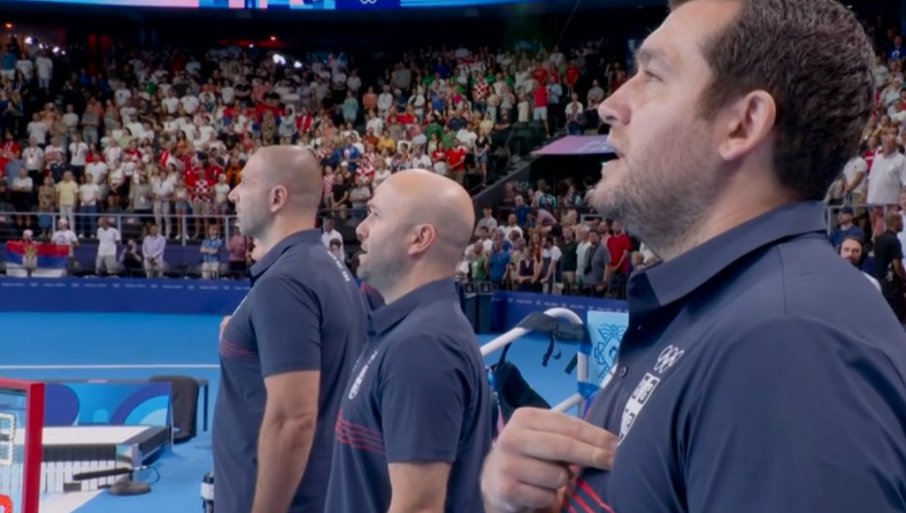 Урош Стевановић, селектор ватрполиста Србије, са три прста на срцу током химне Боже правде пред олимпијско финале / Screenshot / Eurosport