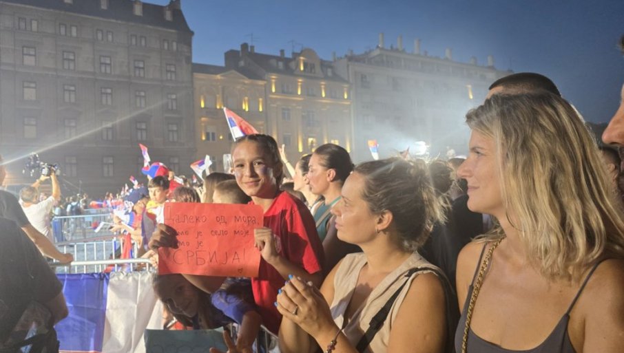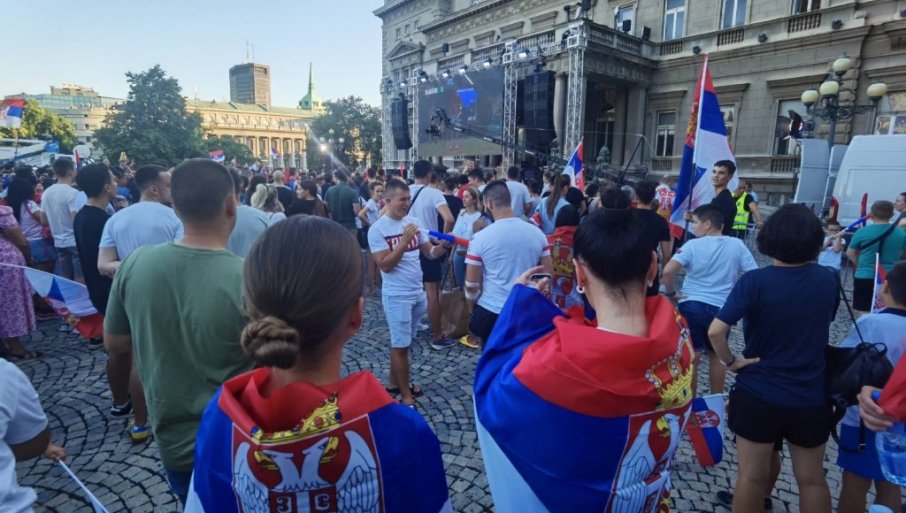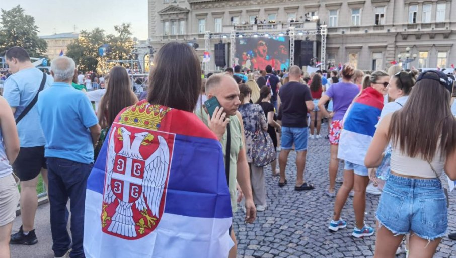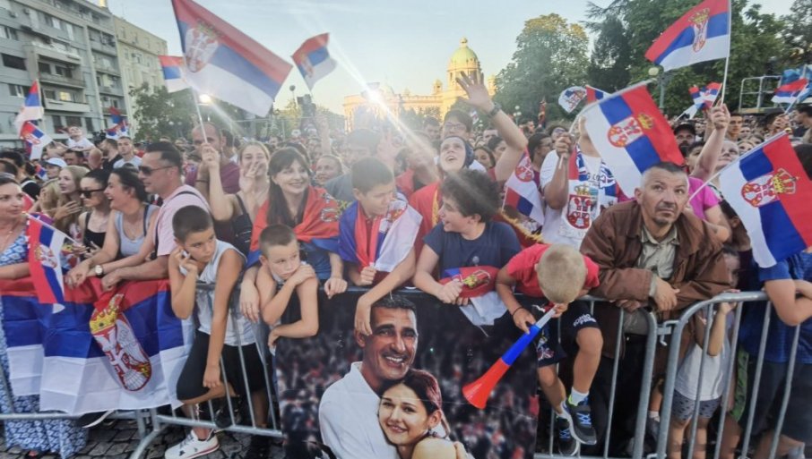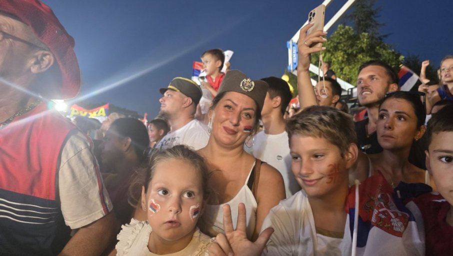 Народ је био огрнут српским тробојкама, носио је и дресове кошаркаша, и ватерполо капице, биле су ту и шајкаче, и транспаренти, и капе у бојама српске заставе...
