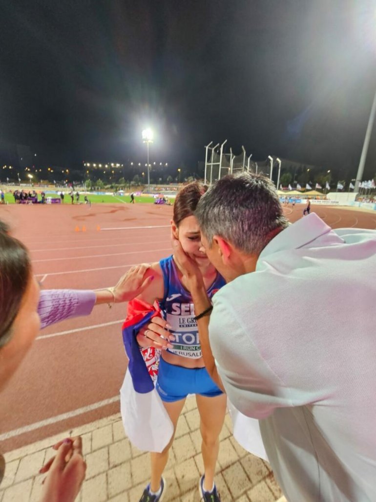 Одмах по освајању златног одличја, млада Ангелина је бризнула у плач, али и у загрљај славног оца Драгутина Топића.