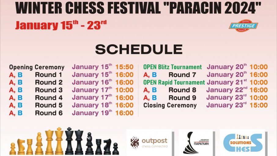 ОМЛАДИНСКИ шаховски клуб „Параћин“ најавио је као организатор почетак традиционалног Зимског шаховског фестивала „Параћин 2024“ који ће трајати од 15. до 23. јануара на базенима „Престиж“ у том граду.