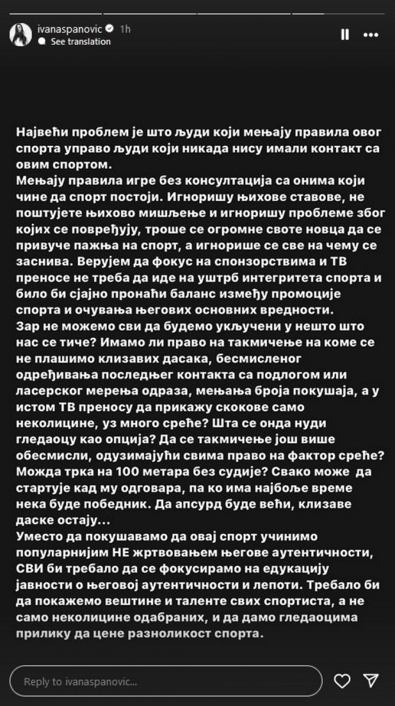 - Највећи проблем је што људи који мењају правила овог спорта су управо они који никада нису имали контакт са овим спортом. Мењате правила игре без консултовања оних који чине да спорт постоји. Игноришете њихове погледе, не поштујете њихово мишљење и игноришете проблеме који их доводе до повреда. Огромне суме новца се троше покушавајући да се привуче пажња на спорт, док се игнорише све на чему спорт почива. Верујем да фокус на спонзорствима и телевизијским емитовањима не би требало да иде на рачун интегритета спорта и било би сјајно пронаћи баланс између промовисања спорта и очувања његових основних вредности. Зар не можемо сви бити укључени у нешто што нас се тиче? Имамо ли право на такмичење где се не бојимо клизавих дасака, бесмисленог утврђивања последњег контакта са површином или ласерског мерења одскока, промене броја покушаја и истовремено у истом телевизијском преносу приказати скок само одабраних, уз много среће? Шта се онда нуди гледаоцу као опција? Да такмичење постане још бесмисленије, лишавајући све права на фактор среће? Можда трка на 100 метара без судије? Сви би требало да крену када им одговара, па ко има најбоље време, нека буде победник. Да апсурд буде још већи, клизаве даске остају... Уместо покушаја да се спорт учини популарнијим жртвујући његову аутентичност, СВИ бисмо требало да се фокусирамо на образовање јавности о његовим нијансама и лепоти. Требало би да приказујемо вештине и таленте свих спортиста, не само одабраних, и пружамо гледаоцима прилику да цене разноликост спорта - написала је у причи на Инстаграму Ивана Шпановић.