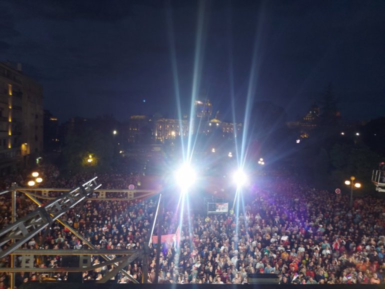 20.19 - Више хиљада људи је већ испунило плато испред Скупштине града Београда. Сјајна сцена, нема шта.