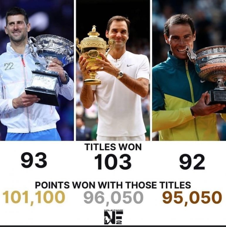 Прво, Швајцарац се пензионисао са 103 титуле, што је десет више од Новака (11 од Рафе), али (и то је оно прво "али") и он заостаје пет титула за Џимијем Конорсом, што би значило да је по тој логици Американац ГОАТ (некада је то мишљење било легитимно). Осим тога, наш тенисер може да га престигне већ до краја ове године, а готово извесно до краја следеће.