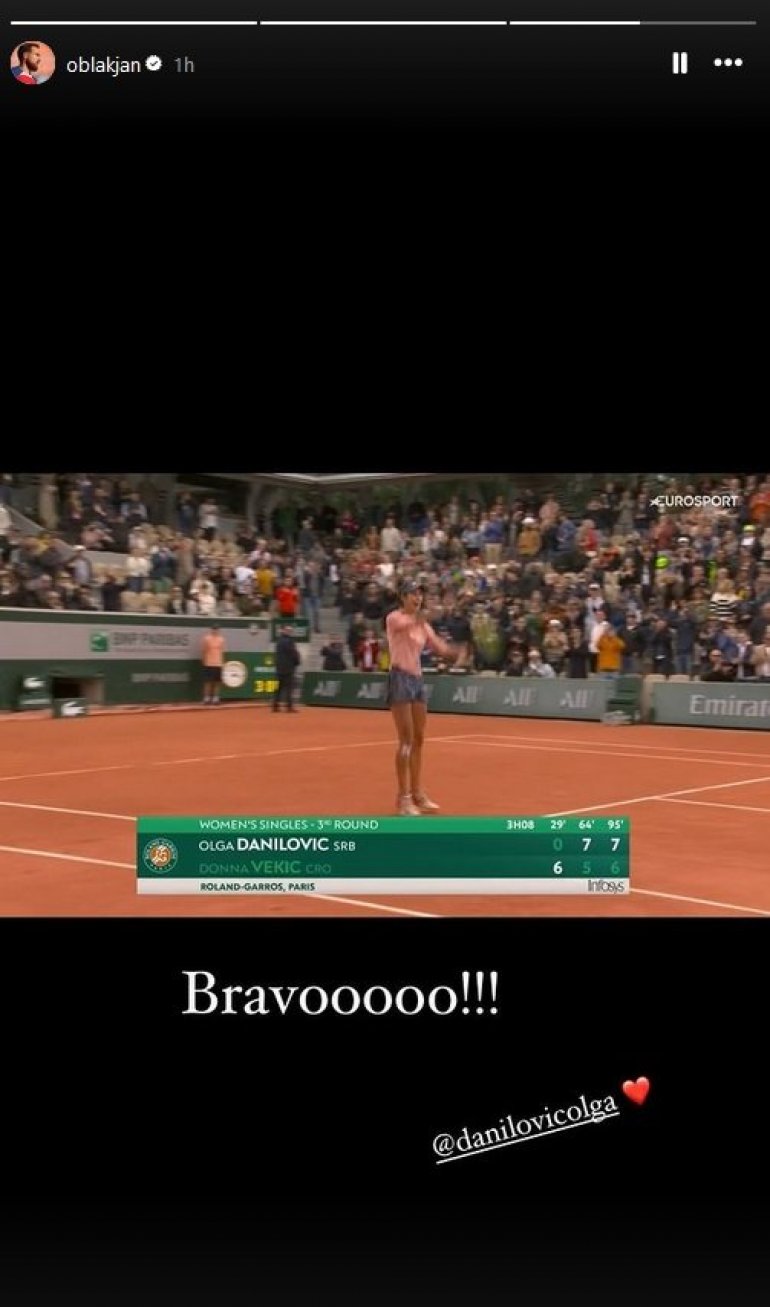 Олга Даниловић се пласирала у осмину финала Ролан Гароса победивши Дону Векић са 2:1 у сетовима, а након тог успеха многи спортисти и јавне личности су јој честитали на успеху.