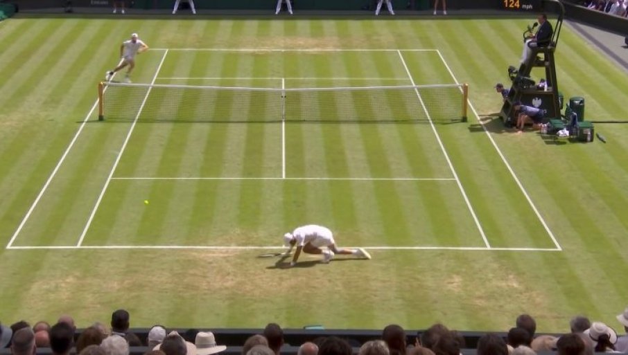 Новак Ђоковић посрће током 5. гема 2. сета са Фернлијем на Вимблдону / Screenshot: RTS