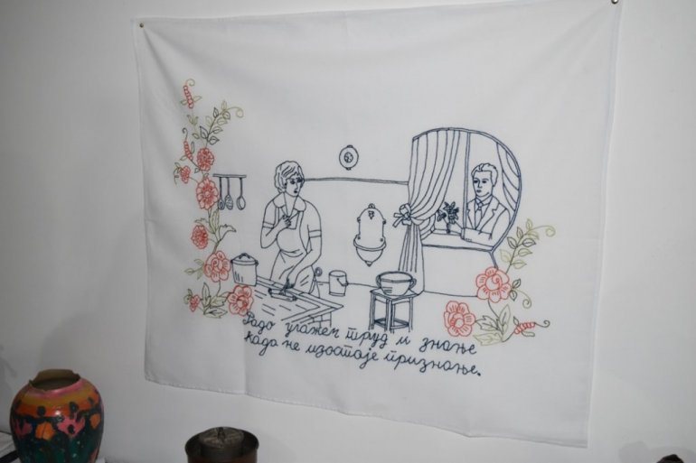 Ту су и неизоставне "куварице", које су некад стајале изнад шпорета и штитиле зид од прскања јела. На тим белим платнима су извезени мотиви из кухиње - обично домаћица за шпоретом, а ту негде и момак или муж - са обавезним шаљивим стихом, од којих је најпознатији: "Куварице, мање збори, да ти ручак не загори".