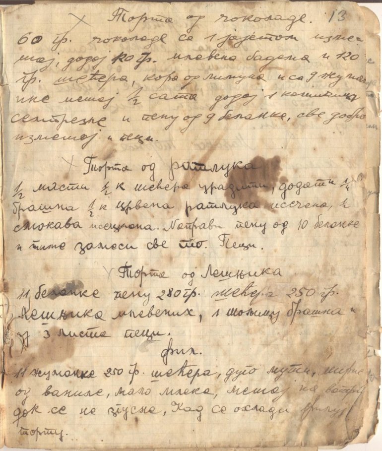 Ова умешна домаћица прикупљала је рецепте за најукусније посластице,своје и од најмање пет пријатељица. Оне су стрпљиво месиле слаткише и понеке, пекле у пећници на дрва. Цела књижица, чије је репринт издање промовисано у Музејској збирци Народног универзитета, броји 73 рецепта. Највише има слатких - 44 за торте и 23 за ситне колаче.