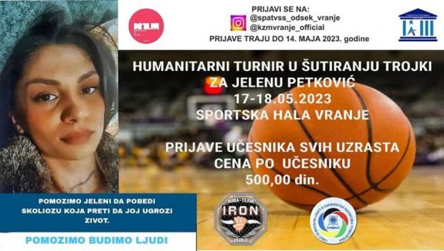 У Спортској хали у Врању почео је дводневни хуманитарни турнир у баскету 3 на 3 и шутирању тројки са којег ће сав приход ићи за лечење двадесетпетогодишње Јелене Петковић.