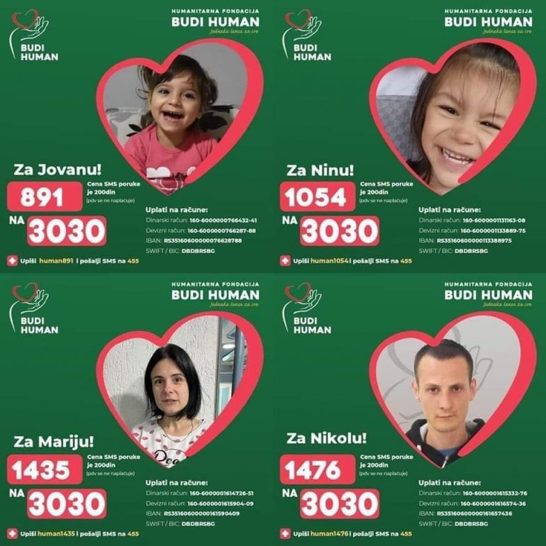 Јована (7) и Нина (6) болују од церебралне парализе, а Марија (35) и Никола (28) од мултипле склерозе. Учесници и пратиоци трке послаће и СМС на 3030 – за Јовану 891, Нину 1054, Марију 1435 и Николу 1476.