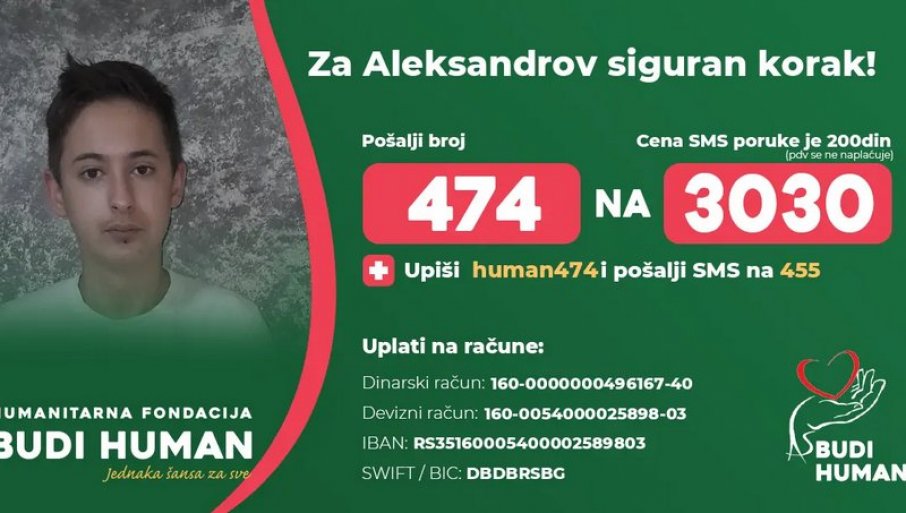 Ко не може да дође и да лично остави прилог, нека узме телефон у руке, укуца 474 и пошаље на 3030 . Тако ће помоћи Аци ускоро почне да корача сигурно – поручили су Александрови суграђани који воде ову хуманитарну акцију, поручује његова породица и пријатељи.