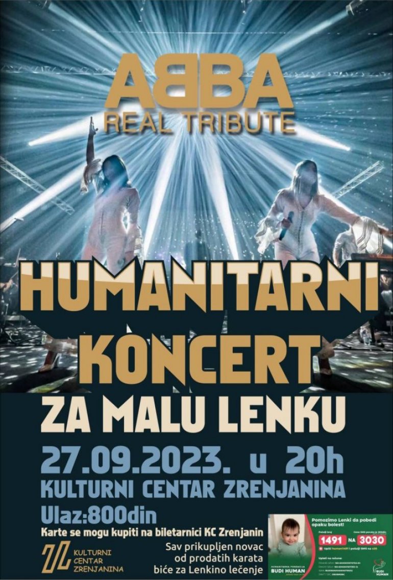 ЗРЕЊАНИНСКИ трибјут бенд ABBA у среду 27. септембра, од 20 часова у Културном центру у Зрењанину, у сарадњи са удружењем Будимо људи, одржаће хуманитарни концерт За малу Ленку, Концерт ће се одржати у среду, 27.