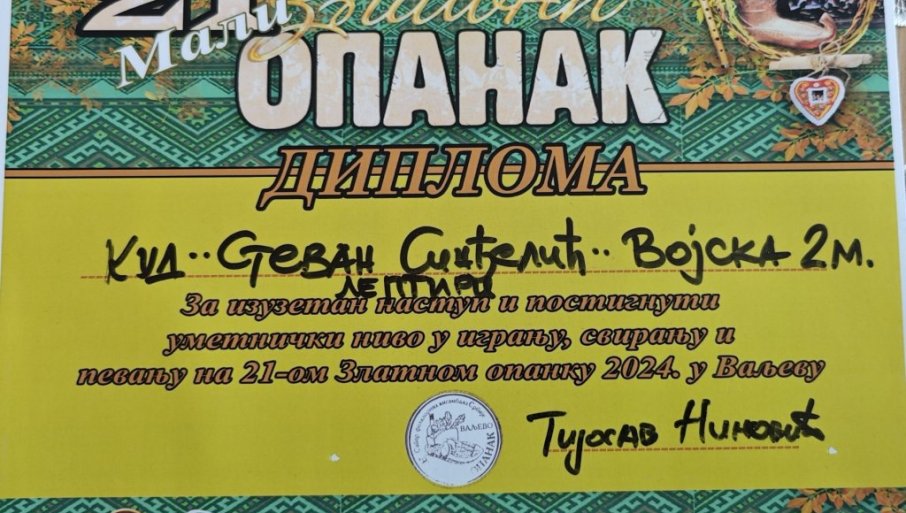- Веома смо поносни на награде, које су резултат преданог рада и љубави према фолклорном наслеђу. Захваљујемо се свим члановима ансамбла, родитељима и свима који су подржали наш труд. Реч је о великом признању и за нашу заједницу што нам је подстрек да наставимо неговање наше традиције и чувамо културно наслеђе – оцењује Јовица Шајатовић, председник фолклорног ансамбла из Војске.