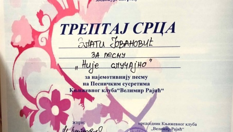 ПАРАЋИНСКА песникиња Злата Јовановић на традиционалној песничкој манифестацији „Алексинац 2024“ добила је награду „Трептај срца“ за најемотивнију песму.