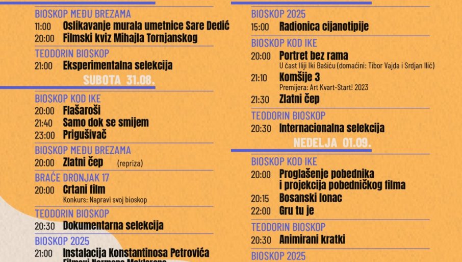 "Биоскоп код Ике", главни и највећи биоскоп назван по реномираном филмском раднику Илији Ики Башићу који је живео на Новом насељу, налази се прекопута Геронтолошког центра, а поред овог су још два и то код "Теодорин биоскоп" са селекцијама интернационалног, документарног и експерименталног филма и "Биоскоп 2025", симболичног назива где ће бити пројектовани другачији филмски формати.