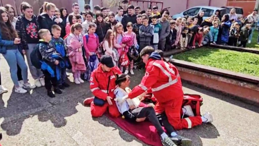 ПАРАЋИНСКИ ВАТРОГАСЦИ И ЦРВЕНИ КРСТ У ЗАЈЕДНИЧКОЈ АКЦИЈИ: Показна вежба евакуације за ученике (ФОТО)