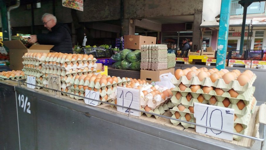 У зависности од величине, цене поступно расту на 10, 12, 13, 14.... до максималних 20 динара по комаду. Без обзира на ову јефтиноћу, гужве пред тезгама са јајима данас уопште није било.