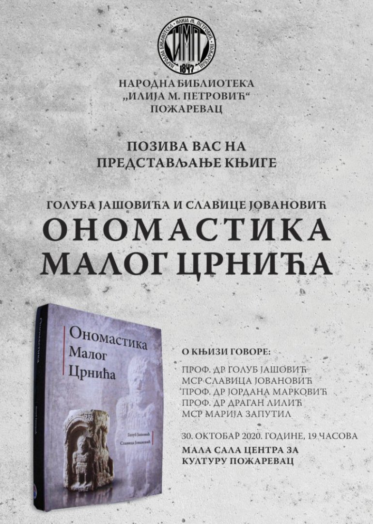 НАРОДНА библиотека „Илија М. Петровић“ у Пожаревцу, 30. октобра организује промоцију књиге „Ономастика Малог Црнића“ Голуба Јашовића и Славице Јовановић.