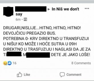 У поруци која кружи друштвеним мрежама позивају се Нишлије да данас у 9 сати дођу у Завод за трансфузију да дају крв за повређену једанаестогодишњакињу.