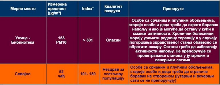 - Деца и стари би требало да остану у својим домовима и смање активности, што се препоручује и особама са срчаним и плућним обољењима. Хронични болесници морају да узимају редовну терапију и, у случају погоршања здравственог стања, обавезно посете лекара - саопштено је из ужичког Завода.