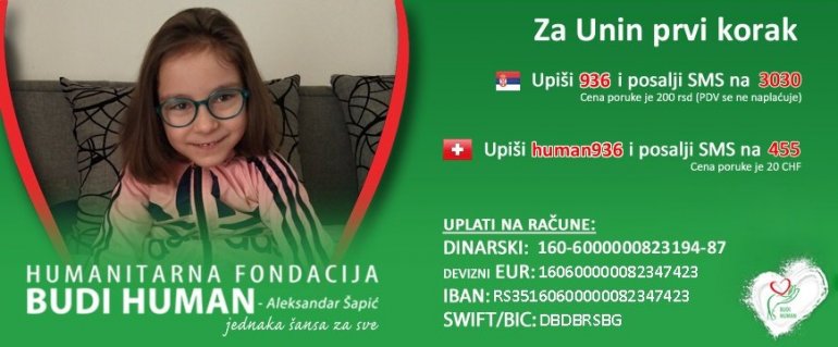 Уна је иначе веселе природе и паметна девојчица, а сви који желе да помогну могу се обратити поменутој Фондацији или да уплате прилоге на рачуне са плаката.