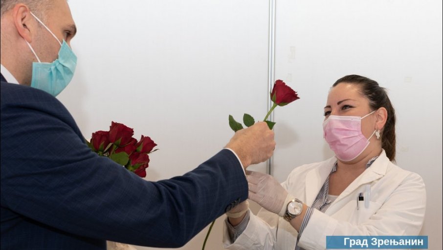 ЦВЕТ ЗА МЕДИЦИНСКЕ РАДНИЦЕ И ВОЛОНТЕРКЕ: Градоначелник Зрењанина посетио суграђанке на пункту за вакцинацију