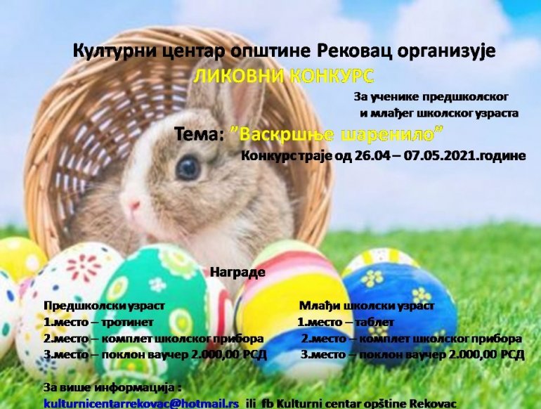 „ВАСКРШЊЕ шаренило“ назив је ликовног конкурса који је Културни центар општине Рековац организовао за ученике предшколског и млађег школског узраста поводом васкршњих празника.