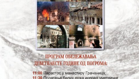 Парастосом у манастиру Грачаница, полагањем белих ружа на спомен-инсталацију MISSING и споменик жртвама Погрома у дворишту Дома културе као и Комеморативном академијом у Дому културе, данас ће у Грачаници бити обележена 21. годишњица Мартовског погрома на Косову и Метохији.