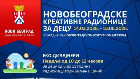 ОПШТИНА Нови Београд организује низ бесплатних креативних радионица за најмлађе од 16. марта, до 15. маја, у просторијама Новобеоградске културне мреже у Блоку 45, Јурија Гагарина 221, саопштили су у овој општини. Пријављивање телефоном или мејлом траје до 14. марта.
