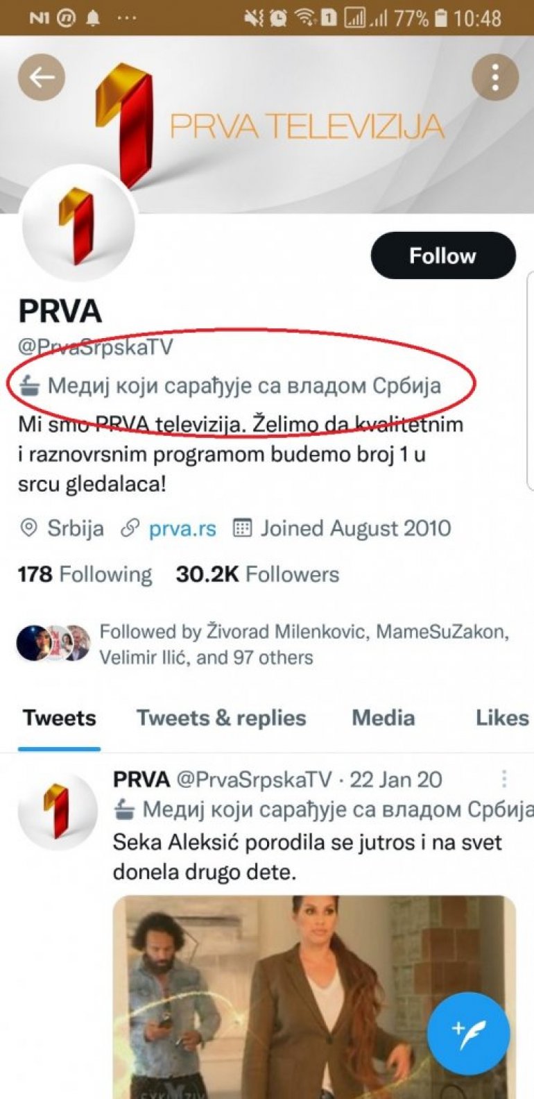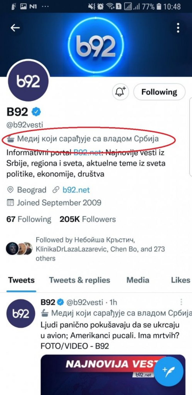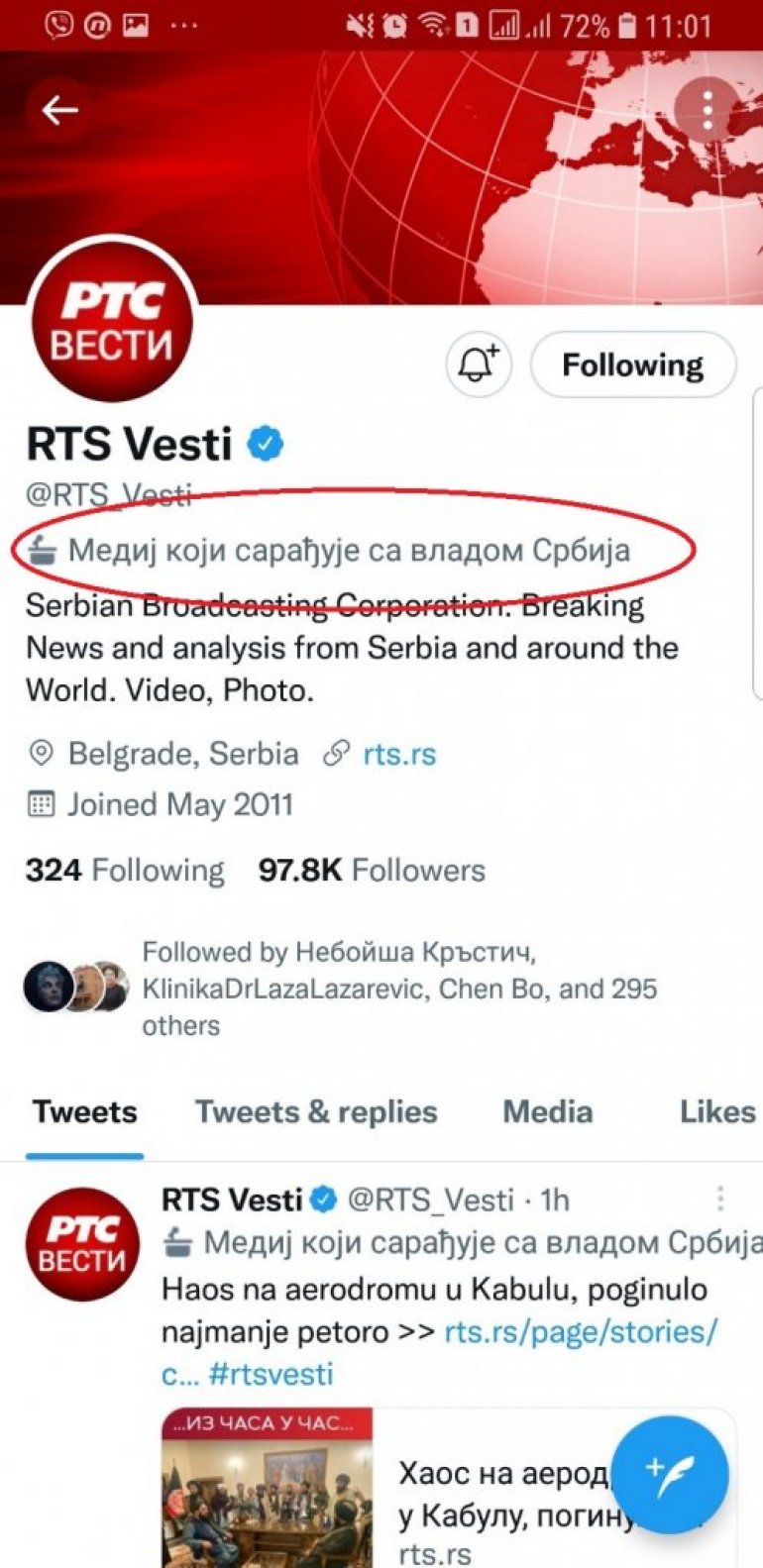 Тако је уз званичне налоге готово свих значајнијих редакција у нашој држави прилепила и етикету - Медиј који сарађује са Владом Србије. Тако су означени РТС, Политика, Прва, Б92, Пинк, Курир, Информер...