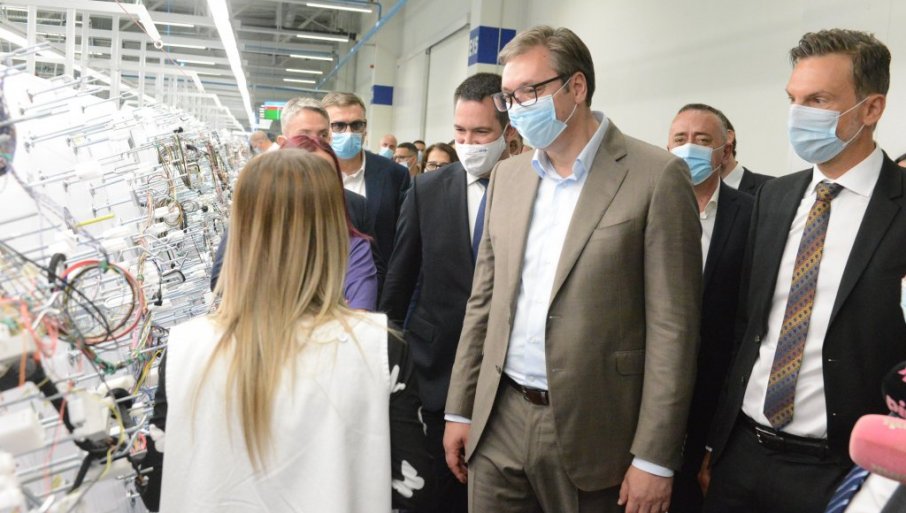 У погону Ленија у Краљеву ради велики број жена, па их је Вучић питао као се сналазе и да да ли је тешко научити то што раде.
