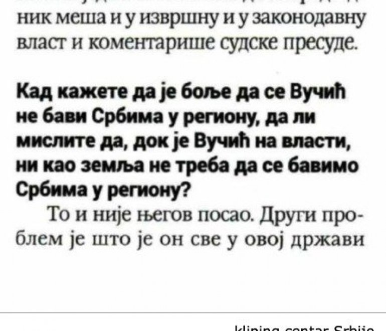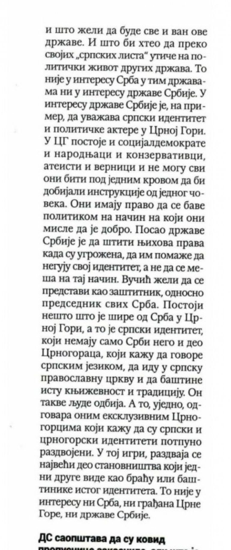 - Други проблем је што је он све у овој држави и што жели да буде све и ван ове државе. И што би хтео да преко својих "српских листа" утиче на политички живот других држава". То није у интересу Срба свих у тим државама, ни у интересу држава Србије.