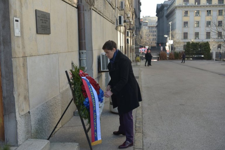 Брнабић је са члановима свог кабинета, венац положила на спомен плочу у дворишту Владе Србије где је убијен први демократски изабран председник владе и некадашњи председник Демократске странке.