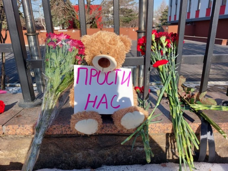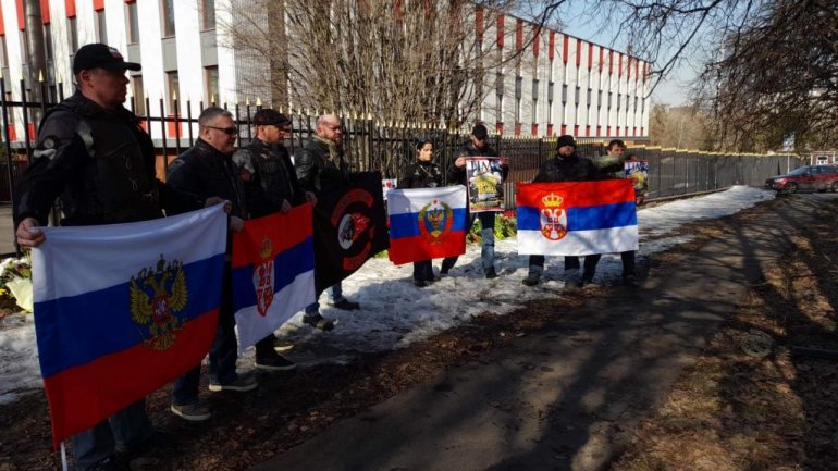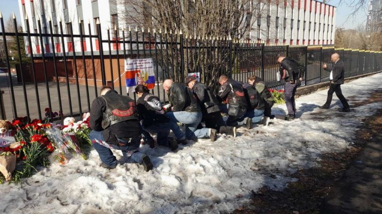 Више од три стотине бајкера је, носећи српске и руске тробојке, клечећи положило венце на огради амбасаде.
