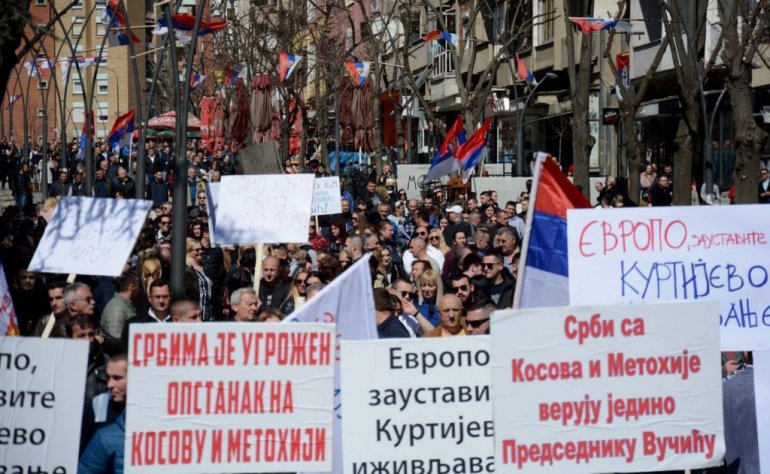 Срби су пристигли са свих страна на централни трг, код споменика Кнезу Лазару, где је у 12 сати почео протестни скуп. Грађани, њих 10.000, потом је прошетало улицама Митровице, носећи транспаренте.