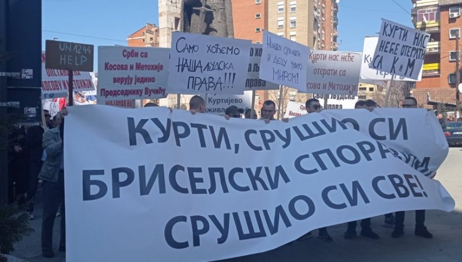 Грађани носе заставе Србије и транспаренте, а на једном пише "Курти, срушио си Бриселски споразум - срушио си све", а на другима "Хоћемо наша људска права", "Стоп Куртијевом терору", "Курти нас неће отерати са Косова и Метохије", "Срби са КиМ верују само председнику Вучићу".