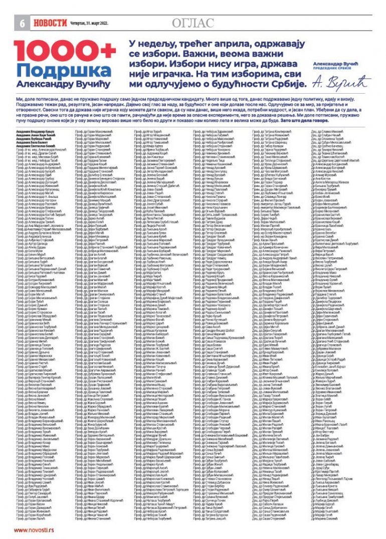 - Ми не пружамо подршку само једном председничком кандидату. Много више од тога, данас подржавамо једну политику, идеју и визију. Подржавамо тежак рад, резултате, јасан напредак. Дајемо свој глас за наду, за будућност и оне који долазе после нас. Одлучујемо се за мир, за пријатеље и отвореност. Свесни тога да држава није играчка коју можете дати сваком, да су нам данас, више него икад, потребни мудрост и јасан став. Убеђени да су дела, а не празне речи, оно што се рачуна и оно што се памти, рачунајући да није време за опасне експерименте, него за доказана решења. Ми пружамо пуну подршку ономе који је у ову земљу веровао више него било ко други и показао нам колико лепа и велика може да буде. Зато што дела говоре - објављено је у име 1000 јавних личности.
