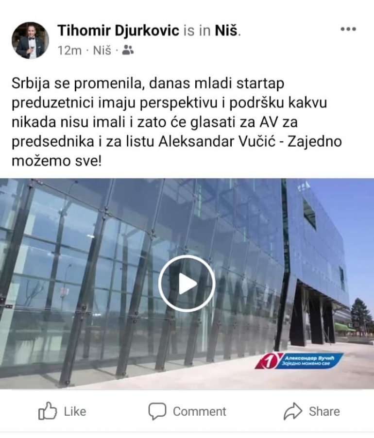 - Србија се променила, данас млади стартап предузетници имају перспективу и подршку какву никада нису имали и зато ће гласати за Александра Вучића за председника и за листу Александар Вучић - Заједно можемо све - написао је.
